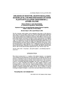 The effect of genotype, growth regulators and preconditioning of donor plants on callus induction in anther culture of flax was investigated. Anthers were cultured on modified MS medium supplemented with five different combinations of plant growth regulators. The results suggested that specific combi- nations of growth regulators must be designed for each genotype. Major differences between the present results and previous reports are discussed. The influence of sucrose concentration was also investigated. For flax cultivar, ‘Mikael’, callus induction was higher in medium supplemented with 1 mg l –1 BAP and 2 mg l –1 2,4D containing 6% sucrose, while this combination of growth regulators significantly increased callogenesis in cultivars ‘Lirina’, ‘Barbara’ and ‘Szaphir’ when supplemented with 9% or 12% sucrose. The preconditioning of donor plants influenced callogenesis in subsequently isolated anthers. Anthers from donor plants grown at a lower temperature (18/14 °C) significantly increased callus induction over those from plants grown at a higher temperature (22/18 °C), although each genotype still required opti- mization of growth regulator combinations in the induction medium. Only ‘Mikael’ regenerated shoots when the callus was from induction medium supplemented with 2 mg l –1 BAP and 1 mg l –1 NAA.