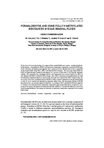 Szilágyi, M. and Németh, Zs. I. and Albert, L. and Sarlós, P. and Tyihák, E. (2006) Formaldehyde and some fully n-methylated substances in boar seminal fluids. Acta Biologica Hungarica, 57 (1). pp. 133-136. ISSN 0236-5383