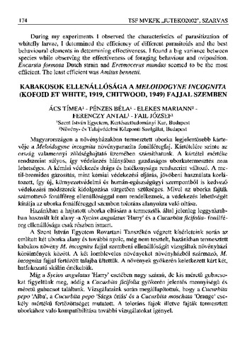 Ács, Tímea and Pénzes, Béla and Elekes, Mariann and Ferenczy, Antal and Fail, József (2002) Kabakosok ellenállósága a Meloidogyne incognita (Kofoid et White, 1919, Chitwood, 1949) fajjal szemben. In: Tessedik Sámuel Jubileumi Mezőgazdasági Víz- és Környezetgazdálkodási Tudományos Napok, 2002. augusztus 29-30., Szarvas, Magyarország.