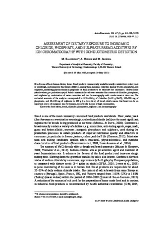 Balcerzak, M. and Rudnik, A. and Jelińska, M. (2018) Assessment of dietary exposure to inorganic chloride, phosphate, and sulphate bread additives by ion chromatography with conductometric detection. Acta Alimentaria, 47 (1). pp. 97-103. ISSN 0139-3006