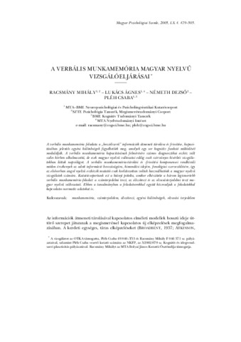 Racsmány, Mihály and Lukács, Ágnes and Németh, Dezső and Pléh, Csaba (2005) A verbális munkamemória magyar nyelvű vizsgálóeljárásai. Magyar Pszichológiai Szemle, 60 (4). pp. 479-506. ISSN 0025-0279