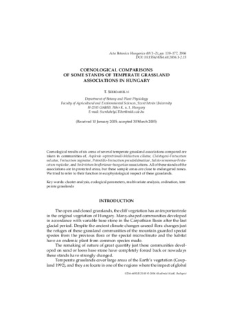 Szerdahelyi, T. (2006) Coenological comparisons of some stands of temperate grassland associations in Hungary. Acta Botanica Hungarica, 48 (1-2). pp. 139-177. ISSN 0236-6495