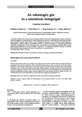 Párkányi, László and Vályi, Péter and Nagy, Katalin and Fráter, Márk (2018) Az odontogén góc és a szisztémás betegségek. Irodalmi áttekintés = Odontogenic foci and systemic diseases. A review. Orvosi Hetilap, 159 (11). pp. 415-422. ISSN 0030-6002