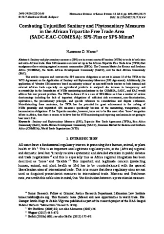 Mbori, Harrison O. (2017) Combating unjustified sanitary and phytosanitary measures in the African tripartite free trade area (SADC–EAC–COMESA): SPS-Plus or SPS-Minus? Hungarian Journal of Legal Studies, 58 (4). pp. 409-433. ISSN 2498-5473
