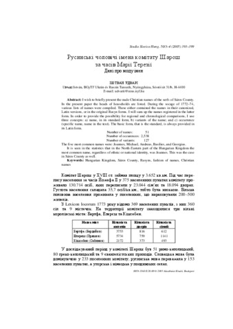 Udvari, István (2005) Русинські чоловічі імена комітату Шарошза часів Марії Терезії. Studia Slavica, 50 (3-4). pp. 393-399. ISSN 0039-3363