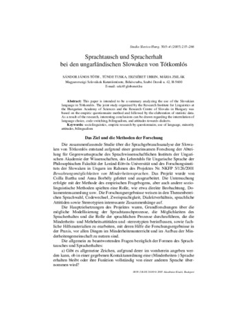 Tóth, Sándor János and Tuska, Tünde and Uhrin, Erzsébet and Zsilák, Mária (2005) Sprachtausch und Spracherhalt bei den ungarländischen Slowaken von Tótkomlós. Studia Slavica, 50 (3-4). pp. 235-266. ISSN 0039-3363