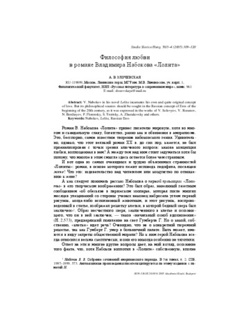 Zlotchevskay, A. B. (2005) Философия любви в романе Владимира Набокова «Лолита». Studia Slavica, 50 (3-4). pp. 309-320. ISSN 0039-3363