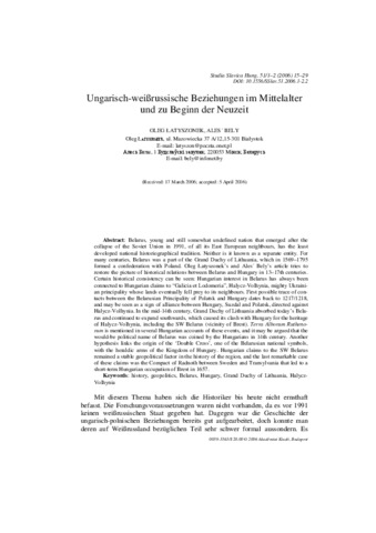 Belarus, young and still somewhat undefined nation that emerged after the collapse of the Soviet Union in 1991, of all its East European neighbours, has the least developed national historiographical tradition. Neither is it known as a separate entity. For many centuries, Belarus was a part of the Grand Duchy of Lithuania, which in 1569-1795 formed a confederation with Poland. Oleg Łatyszonek's and Ales´ Bely's article tries to restore the picture of historical relations between Belarus and Hungary in 13-17th centuries. Certain historical consistency can be seen: Hungarian interest in Belarus has always been connected to Hungarian claims to “Galicia et Lodomeria”, Halycz-Volhynia, mighty Ukrainian principality whose lands eventually fell prey to its neighbours. First possible trace of contacts between the Belarusian Principality of Polatsk and Hungary dates back to 1217/1218, and may be seen as a sign of alliance between Hungary, Suzdal and Polatsk, directed against Halycz-Volhynia. In the mid-14th century, Grand Duchy of Lithuania absorbed today's Belarus and continued to expand southwards, which caused its clash with Hungary for the heritage of Halycz-Volhynia, including the SW Belarus (vicinity of Brest). Terra Alborum Ruthenorum is mentioned in several Hungarian accounts of these events, and it may be argued that the would-be political name of Belarus was coined by the Hungarians in 14th century. Another hypothesis links the origin of the 'Double Cross', one of the Belarusian national symbols, with the heraldic arms of the Kingdom of Hungary. Hungarian claims to the SW Belarus remained a stable geopolitical factor in the history of the region, and the last remarkable case of these claims was the Compact of Radnoth between Sweden and Transylvania that led to a short-term Hungarian occupation of Brest in 1657.