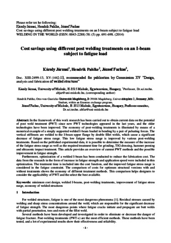 Jármai, Károly and Pahlke, Hendrik and Farkas, József (2014) Cost savings using different post welding treatments on an I-beam subject to fatigue load. WELDING IN THE WORLD, 58 (5). pp. 691-698. ISSN 0043-2288