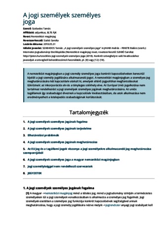 Szabados, Tamás (2018) A jogi személyek személyes joga. In: Internetes Jogtudományi Enciklopédia. Pázmány Péter Katolikus Egyetem, Jog- és Államtudományi Kar (PPKE JÁK), Budapest, pp. 1-11. ISBN 978-963-308-307-9
