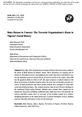 Besenyő, János and Mayer, Ádám (2015) Boko Haram in Context: The Terrorist Organization's Roots in Nigeria's Social History. DEFENCE AGAINST TERRORISM REVIEW, 7 (1). pp. 47-58. ISSN 1307-9190
