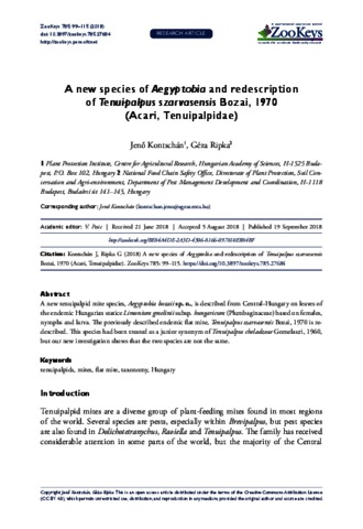 Kontschán, Jenő and Ripka, G. (2018) A new species of Aegyptobia and redescription of Tenuipalpus szarvasensis Bozai, 1970 (Acari, Tenuipalpidae). ZOOKEYS, 785. pp. 99-115. ISSN 1313-2989