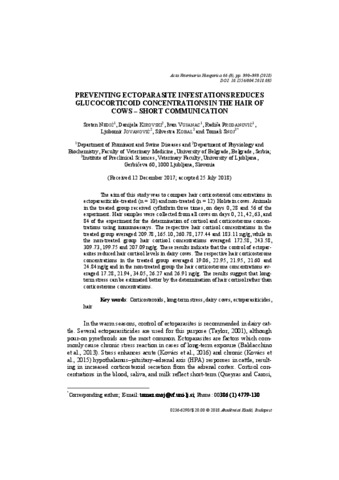 Nedić, Sreten and Kirovski, Danijela and Vujanac, Ivan and Prodanović, Radiša and Jovanović, Ljubomir and Kobal, Silvestra and Snoj, Tomaž (2018) Preventing ectoparasite infestations reduces glucocorticoid concentrations in the hair of cows – short communication. Acta Veterinaria Hungarica, 66 (3). pp. 390-393. ISSN 0236-6290