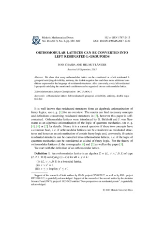 Länger, Helmut and Chajda, Ivan (2017) Orthomodular lattices can be converted into left residuated l-groupoids. Miskolc Mathematical Notes, 18 (2). pp. 685-689. ISSN 1787-2405 (print), 1787-2413 (elecronic)