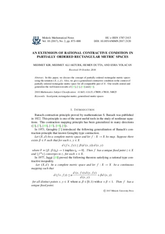 Dutta, Hemen and Kir, Mehmet and Akturk, Mehmet Ali and Yolacan, Esra (2017) An Extension of Rational Contractive Condition in Partially Ordered Rectangular Metric Spaces. Miskolc Mathematical Notes, 18 (2). pp. 873-888. ISSN 1787-2405 (print), 1787-2413 (elecronic)