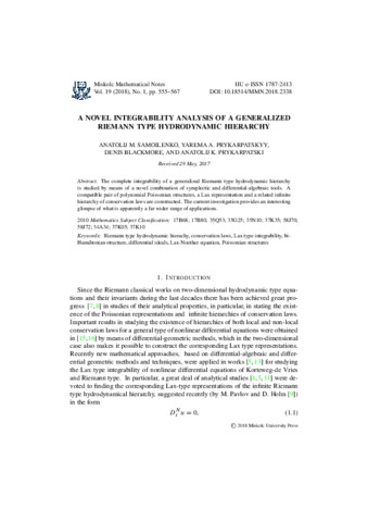 Prykarpatski, Anatolij and Samoilenko, Anatolij and Blackmore, Denis and Prykarpatsky, Yarema (2018) A novel integrability analysis of a generalized Riemann type hydrodynamic hierarchy. Miskolc Mathematical Notes, 19 (1). pp. 555-567. ISSN 1787-2405 (print), 1787-2413 (elecronic)