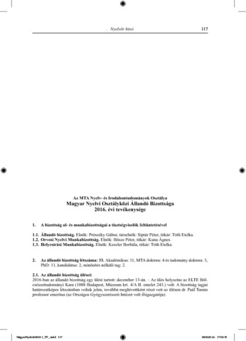 Tóth, Etelka (2018) Az MTA Nyelv- és Irodalomtudományok Osztálya Magyar Nyelvi Osztályközi Állandó Bizottsága 2016. évi tevékenysége. MAGYAR NYELVŐR, 142 (1). pp. 117-124. ISSN 0025-0236