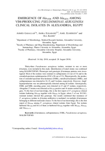 Gaballah, Ahmed and Elbaradei, Amira and Elsheredy, Amel and Kader, Ola (2019) Emergence of bla<sub>VEB</sub> and bla<sub>GES</sub> among VIM-producing Pseudomonas aeruginosa clinical isolates in Alexandria, Egypt. Acta Microbiologica et Immunologica Hungarica, 66 (1). pp. 131-142. ISSN 1217-8950
