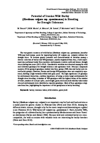 Barati, M. and Majidi, M.M. and Mirlohi, A. and Safari, M. and Mostafavi, F. and Karami, Z. (2018) Potential of Iranian wild barley (Hordeum vulgare ssp. spontaneum) in breeding for drought tolerance. Cereal Research Communications, 46 (4). pp. 707-716. ISSN 0133-3720