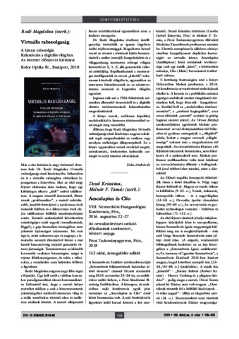 Könyvismertetések. Rodé Magdolna (szerk.):Virtuális rabszolgaság A látszat rabszolgái. Kalandozás a digitális világban. Az internet előnyei és hátrányaiKolor Optika Bt., Budapest, 2018 | Dezső Krisztina, Molnár F. Tamás (szerk.):Aesculapius és Clio VIII. Nemzetközi Hungarológiai Konferencia, Pécs, 2016. augusztus 22–27. Az orvoslástörténeti szekció előadásainak szerkesztett, bővített anyaga Pécsi Tudományegyetem, Pécs, 2018 152 oldal, ármegjelölés nélkül | Újabb dimenziók az EESZT használatával
