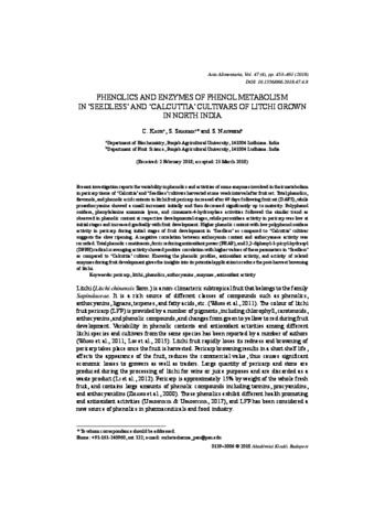 Kaur, C. and Sharma, S. and Navprem, S. (2018) Phenolics and enzymes of phenol metabolism in ‘Seedless’ and ‘Calcuttia’ cultivars of litchi grown in North India. Acta Alimentaria, 47 (4). pp. 453-461. ISSN 0139-3006