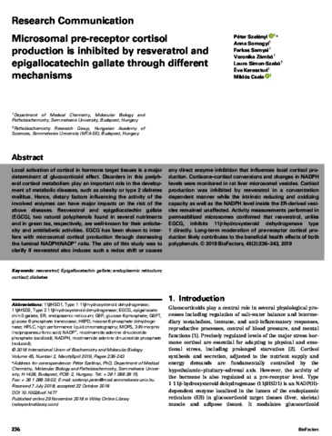 Szelényi, Péter and Somogyi, Anna and Sarnyai, Farkas and Zámbó, Veronika and Simon-Szabó, Laura and Kereszturi, Éva and Csala, Miklós (2018) Microsomal pre-receptor cortisol production is inhibited by resveratrol and epigallocatechin gallate through different mechanisms. BioFactors, 45 (2). pp. 236-243. ISSN 1872-8081